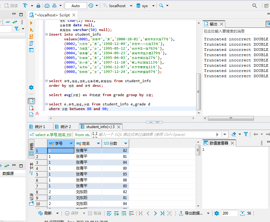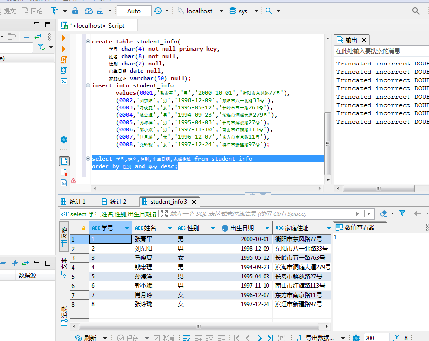 1.对student_info表,查询学生的学号、姓名、性别、出生日期及家庭住址,查询结果先按照性别的由小到大排序,性别相同的再按学号由大到小排序。