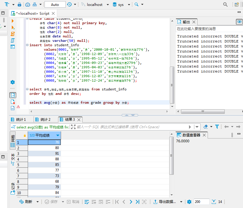 2.使用GROUP BY子句查询grade表中各个学生的平均成绩。