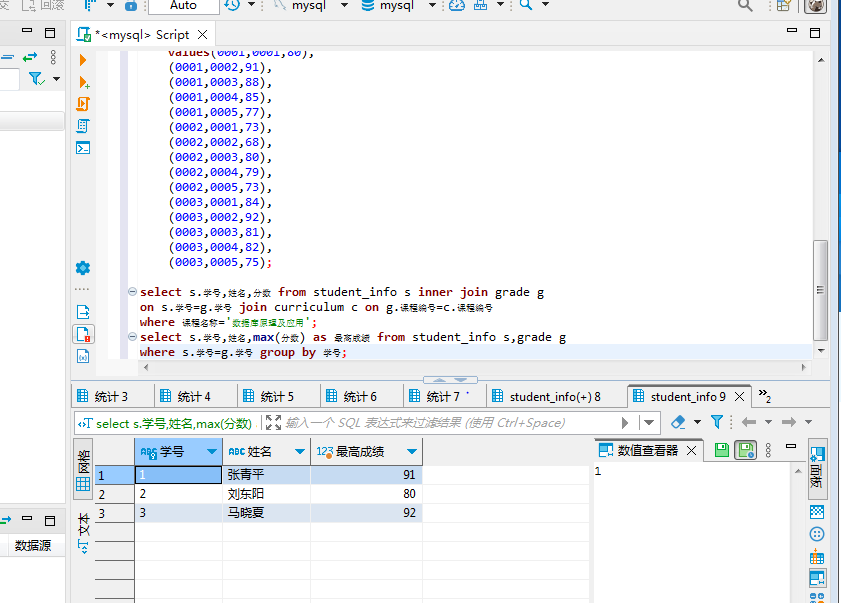 select s.学号,姓名,max(分数) as 最高成绩 from student_info s,grade g