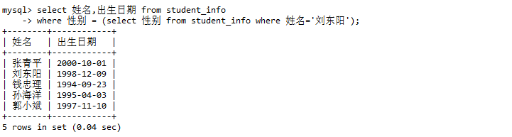 1.在student_info表中查找与“刘东阳”性别相同的所有学生的姓名、出生日期。
