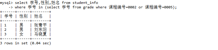 2.使用IN子查询查找所修课程编号为0002、0005的学生学号、姓名、性别。