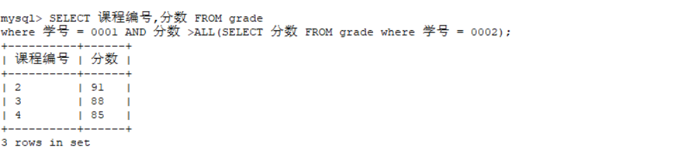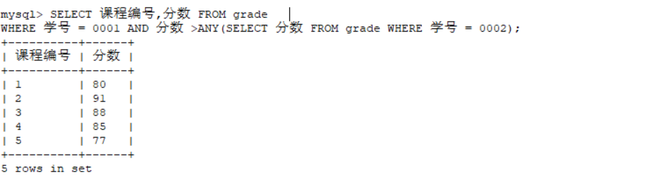 WHERE 学号 = 0001 AND 分数 >ANY(SELECT 分数 FROM grade WHERE 学号 = 0002);