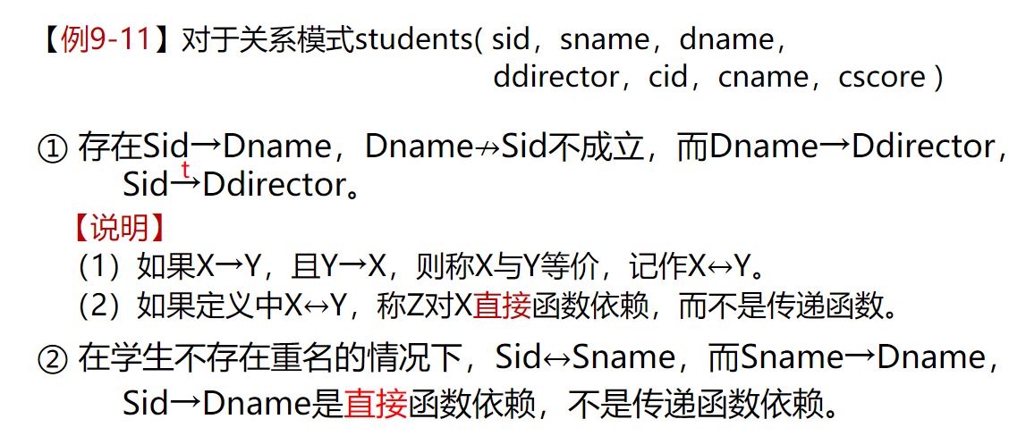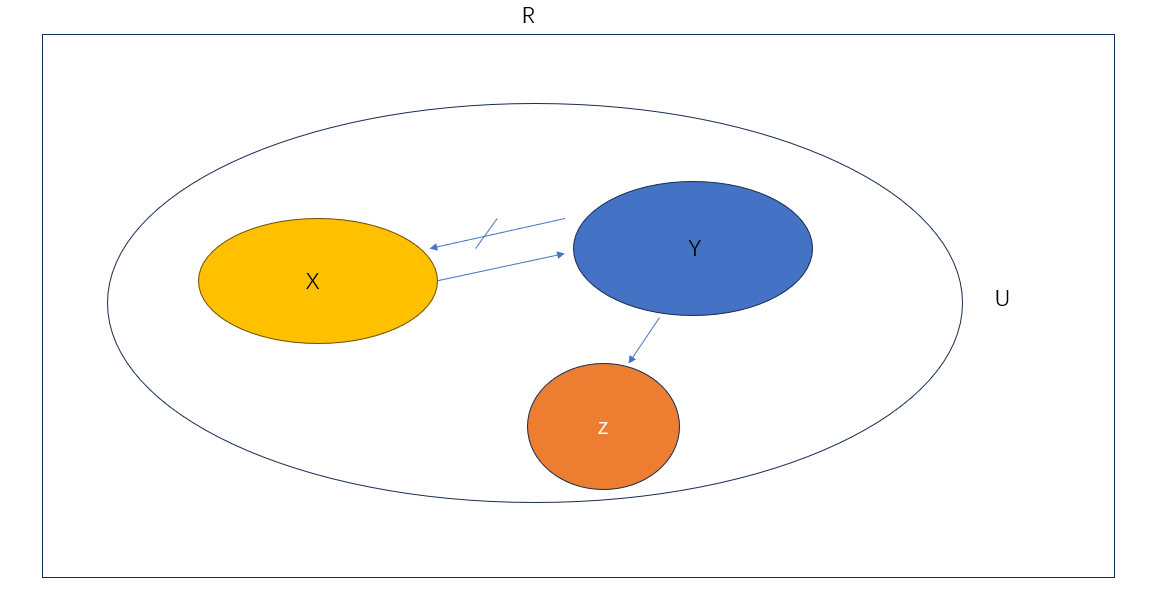 3、如果 X 函数决定 Y,Y 函数决定Z,且 Y、Z 都不包含于 X,Z 不包含于 Y ,Y 不能决定 X,则称 Z 传递函数依赖于 X。 注意!:若 可以得到,但 不能说 Z 传递函数依赖于 X。