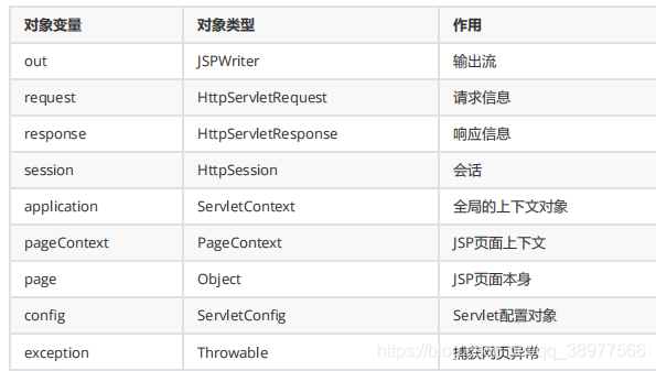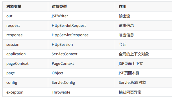 - 在JSP程序中有9个内置对象由容器为用户进行实例化,程序员可以不用定义就直接使用这些变量。