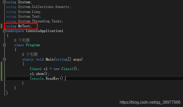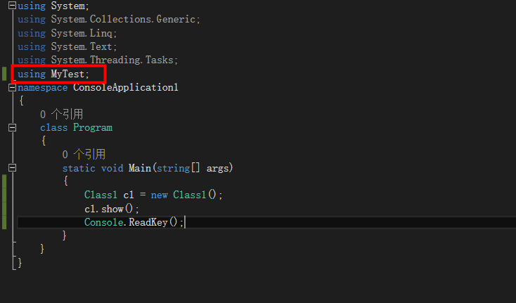 接下来就是引用dll文件,打开控制台程序类,先添加using,如图所示。