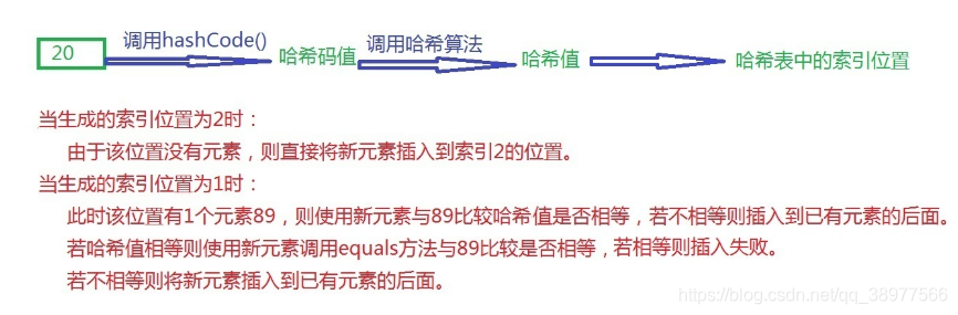 - 若新元素与已有元素的哈希值相同,则使用新元素调用equals方法与已有元素依次比较。