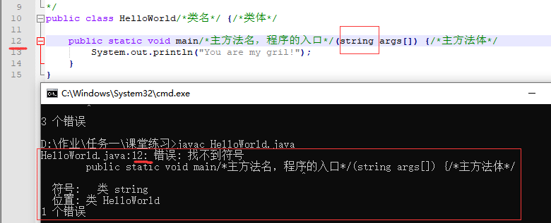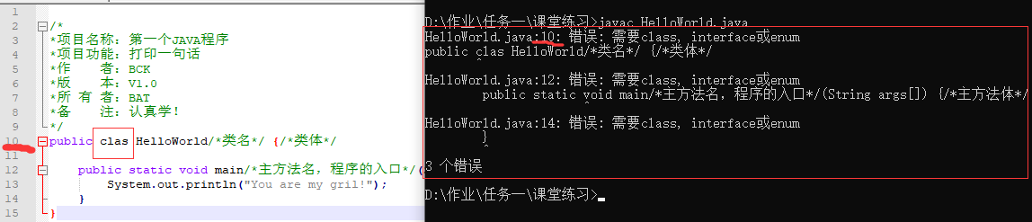错误: 需要class, interface或enum ---->通常都是class关键字拼写错误