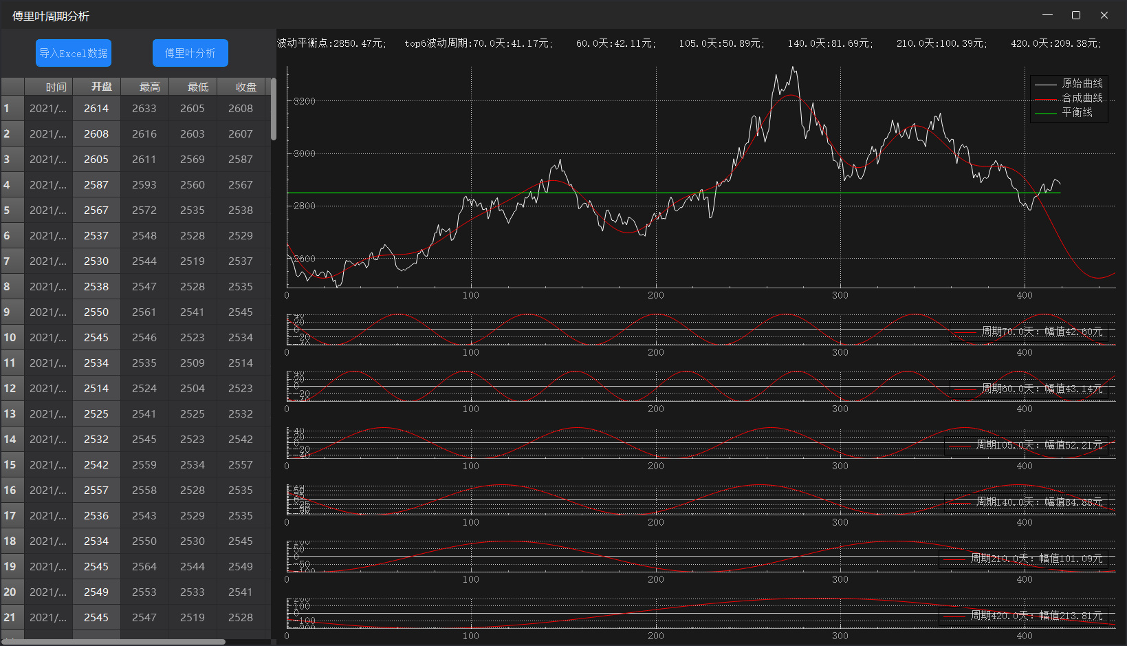 本软件可用于股票、期货、基金、实验数据的傅里叶周期性分析和趋势预测,主要的功能是通过Excel自动导入数据,可以是多列数据,然后选择其中的一列数据进行傅里叶周期分析,将一条无规则的曲线分解成多个周期波形,显示其中幅值最大的6条波形和周期,并根据6条波形公式计算出合成曲线,以及对未来走势的预测。