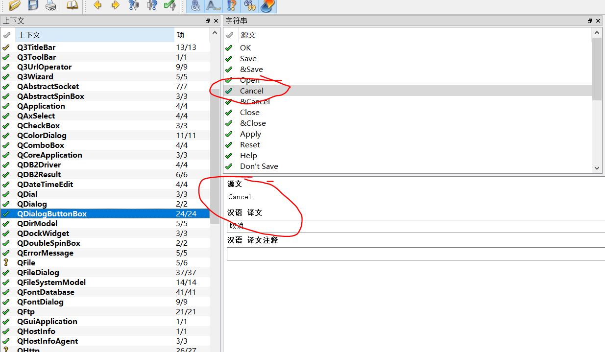 发现QFileDialog的中用QDialogButtonBox按钮中已经包含取消的翻译,只是没有起作用;