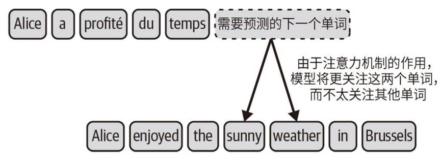 (1)交叉注意⼒,输出文本时,关注输入文本中的关键词,忽略不重要的信息,预测输出文本中下一个单词,输出和关键词相关性高的文本;例如翻译Alice enjoyed the sunny weather in Brussels的时候,关注sunny weather;