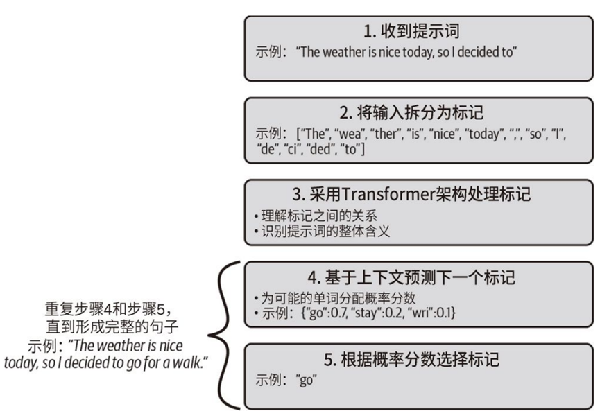 LLM 根据提⽰词的上下⽂预测最有可能出现的下⼀个标记,上下⽂作为⼀个整体来考虑。基于这个上下⽂,模型为每个潜在的后续标记分配⼀个概率分数,然后选择概率最⾼的标记作为序列中的下⼀个标记。GTP模型的预测推理步骤如下图所示: