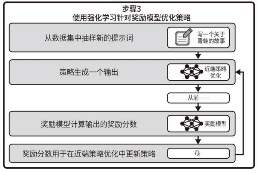 (3)使⽤奖励模型进⾏强化学习。强化学习是⼀个迭代的过程,SFT初始模型输出结果,奖励模型评分,根据得到的奖励分数,相应地更新⽣成式模型,然后循环往复。