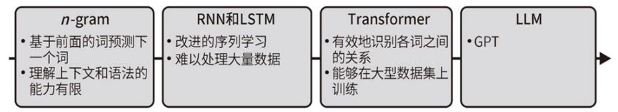 LLM开始于简单的语⾔模型,如 n-gram,词频来根据前⾯的词预测句⼦中的下⼀个词,其预测结果是在训练⽂本中紧随前⾯的词出现的频率最⾼的词。为了提⾼ n-gram 模型的性能,⼈们引⼊了更先进的学习算法,包括循环神经⽹络(recurrent neural network,RNN)和⻓短期记忆(long short-term memory,LSTM)⽹络。能学习更⻓的序列,并且能够更好地分析上下⽂,但它们在处理⼤量数据时的效率欠佳;然后发展到tranfermer架构,最后到GPT;
