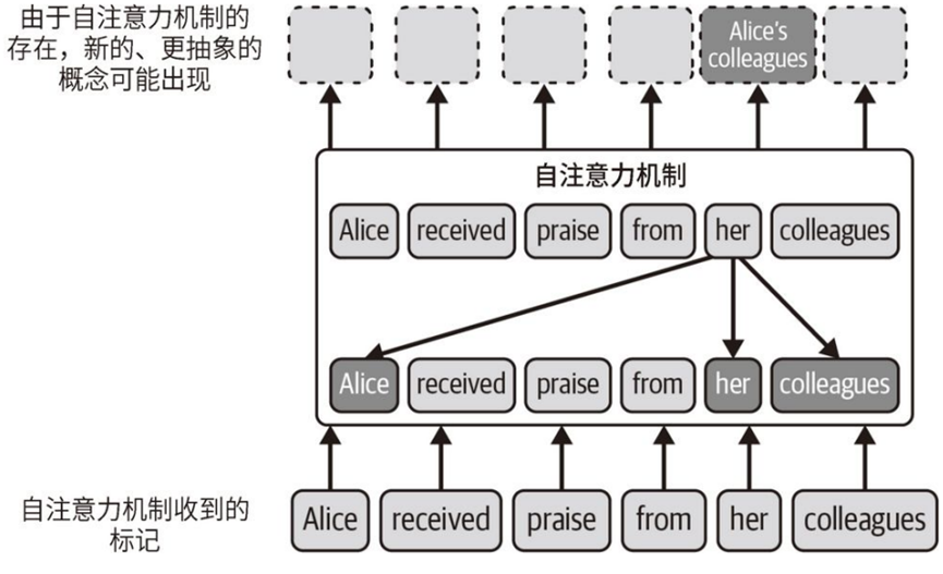 (2)⾃注意⼒机制,使模型能够评估句⼦中的每个词相⽐于其他词的重要性。这使得模型能够更好地理解各词之间的关系。并根据输⼊⽂本中的多个词构建新词。例如Alice received praise from her colleagues,要理解 her 这个单词,⾃注意⼒机制给句⼦中的Alice和colleagues分配更多的权重,也可以组成新词Alice's colleagues;