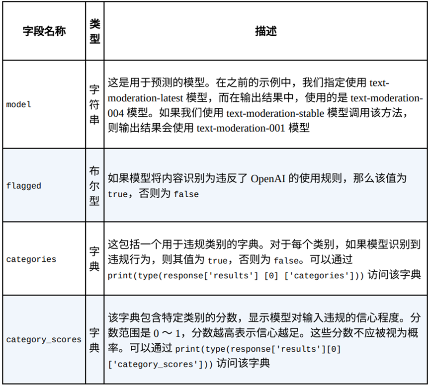 OpenAI 提供了⼀个模型来检查内容是否符合使用规则。识别用户输入对种族、性别、⺠族、宗教、国籍、残疾或种姓的仇恨。对特定群体的暴⼒⾏为或严重伤害。内容涉及⾃残⾏为。内容涉及性⾏为,涉及 18 岁以下的未成年⼈。内容涉及崇尚暴⼒或者给他⼈造成痛苦或羞辱。内容涉及详尽地描绘死亡、暴⼒或严重的⾝体伤害。