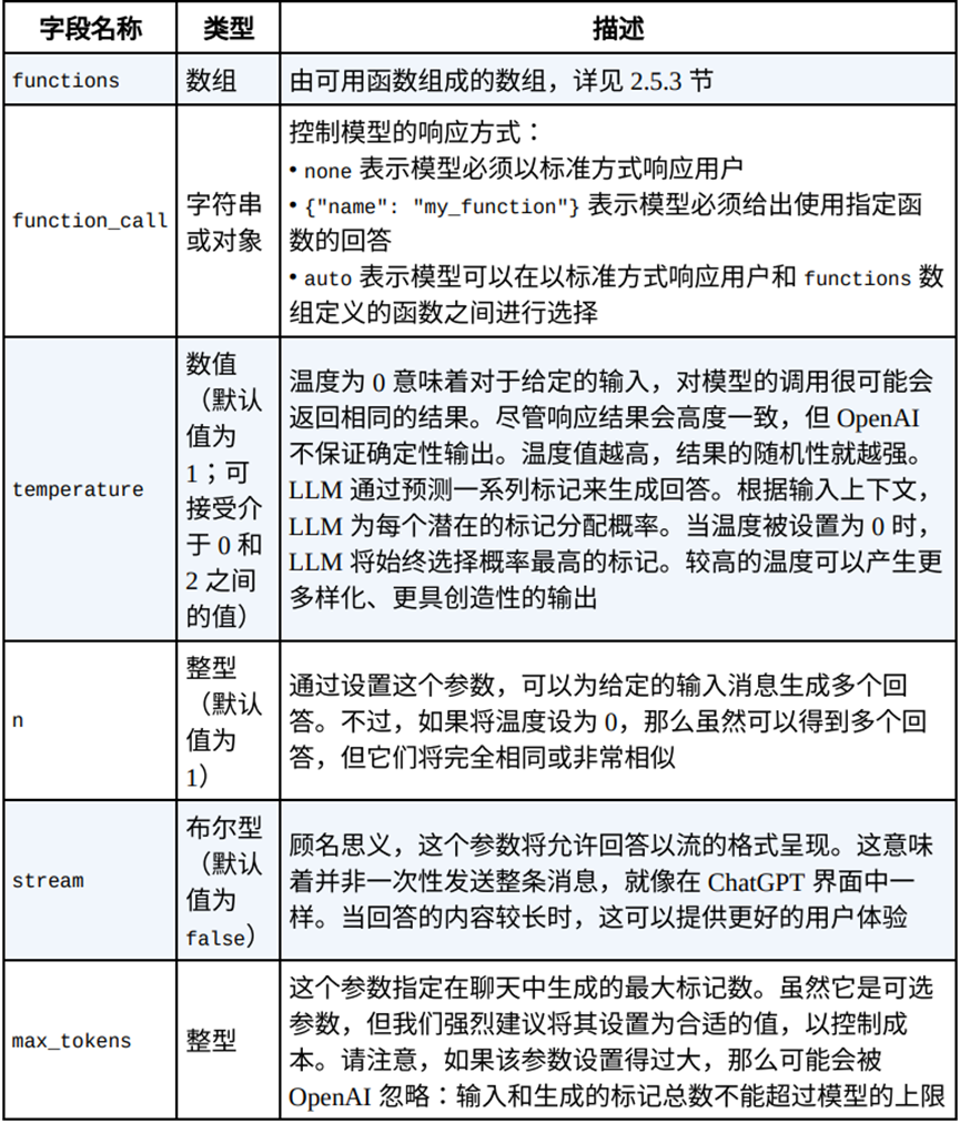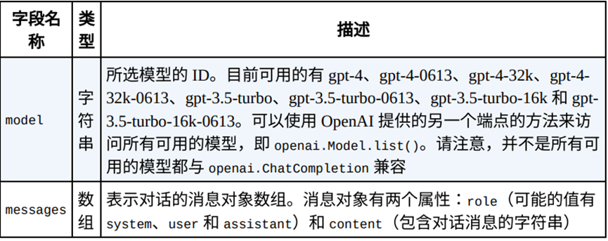 ChatCompletion 端点及其有多个输⼊参数,但只有两 个是必需的,如表 2-1 所⽰。