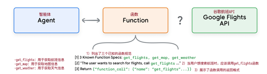 完成特定任务的自包含代码模块,模型能够识别一组已知函数,并基于其规范决定何时使用每个函数及所需的输入参数和输出结果。客户端发起查询,智能将查询和一些示例发给模型,模型根据提示和示例输出调用什么函数和输入参数,客户端解析json中的函数名称和参数,客户端负责根据函数提供的指令来调用相应的 API 端点。