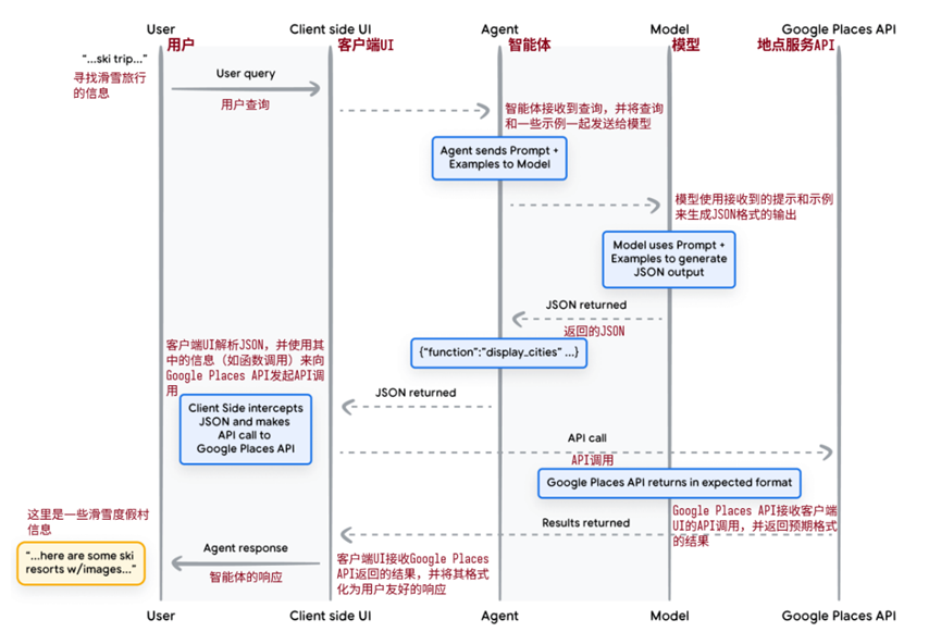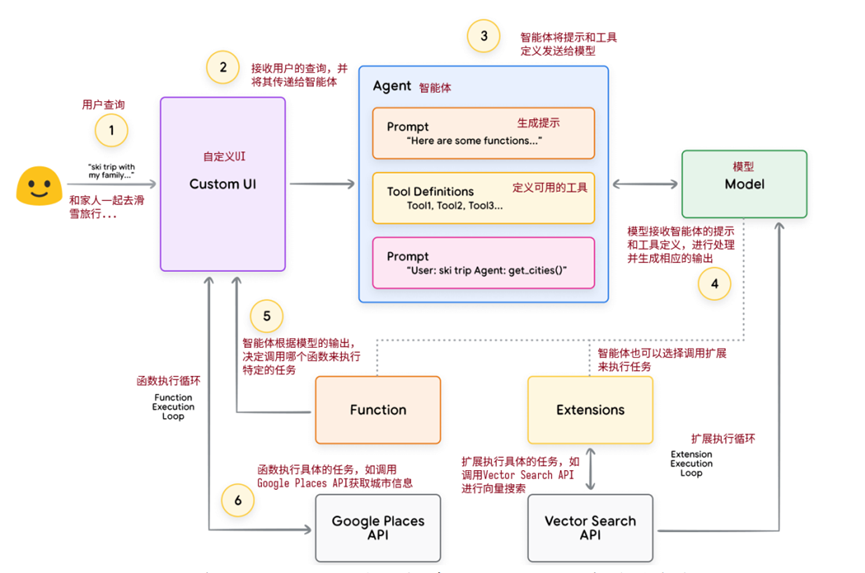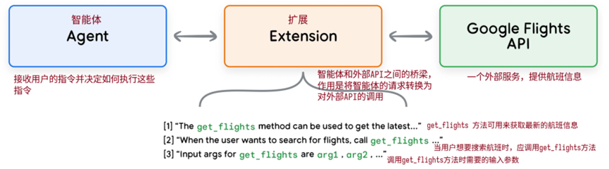 视为一种标准化工具,例如航班,地图,天气扩展等;扩展是智能体和API之间的桥梁,作用是将智能体查询转换为API调用;智能体在运行时使用模型和示例来决定哪个扩展(如果有 的话)最适合解决用户的查询。类似于程序员解析协议参数,然后调用接口的过程;如果航班查询中少了出发地,该怎么处理;