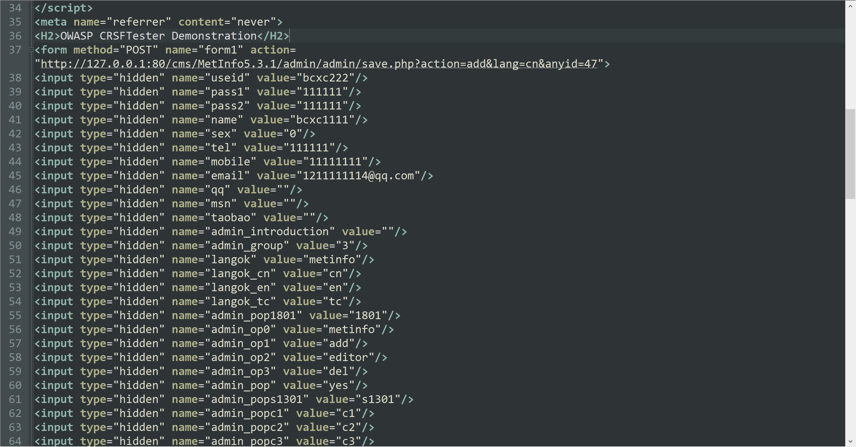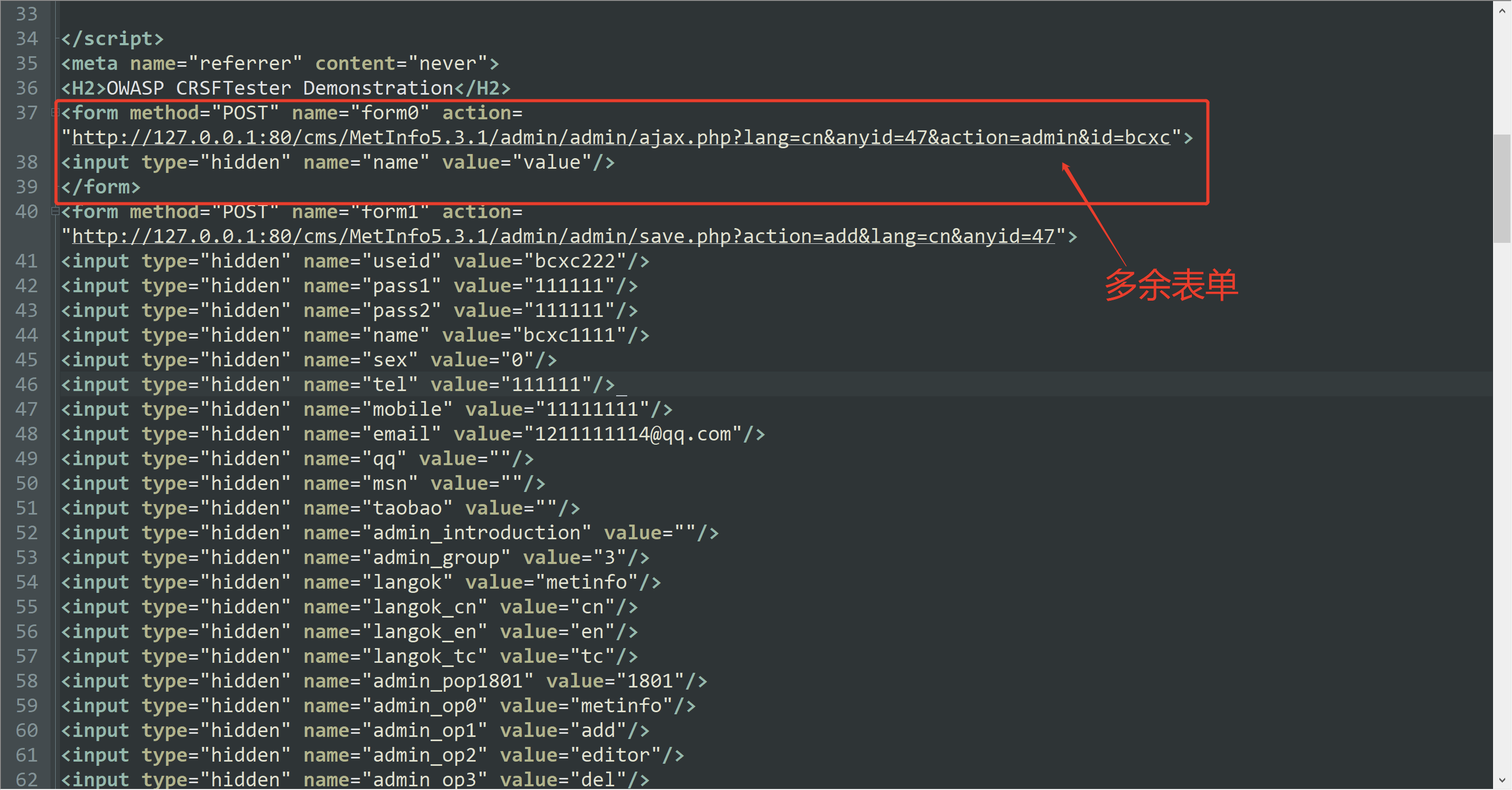接下来进行通过CSRFTester捕获到了提交表单数据包,生成带有工具的页面