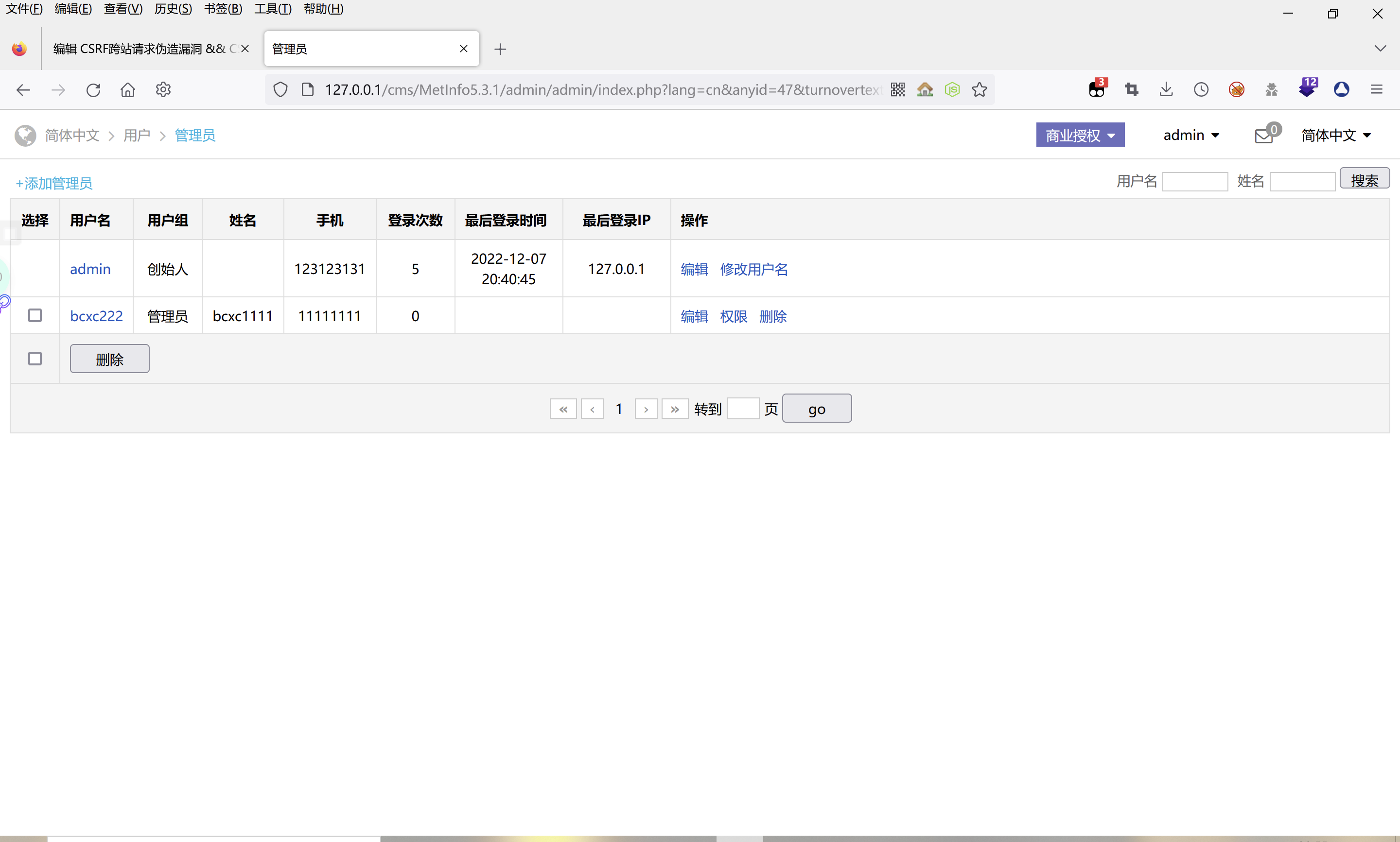 (4)访问CSRF.html后,成功添加bcxc222管理员