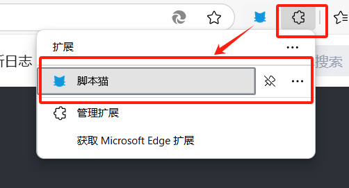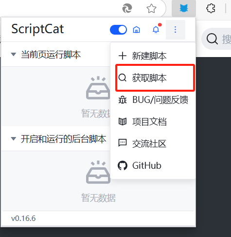 在扩展里面(浏览器地址输入栏的右边)点击脚本猫插件,进入到配置页面,点击“获取新脚本”
