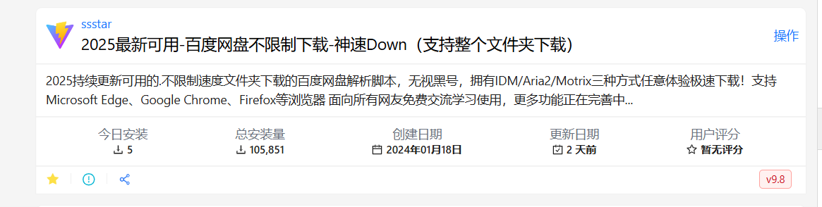今天在篡改猴里面找到了一个脚本,经过测试,非常好用,免费不限速,1.8G的资源也就几分钟就下载完成了,推荐给大家-神速Down丨神速Down简介:不限制速度下载的百度网盘解析脚本,无视黑号,拥有IDM/Aria2/Motrix三种方式任意体验极速下载!支持Microsoft Edge、Google Chrome、Firefox等原生浏览器 面向所有网友免费交流学习使用。