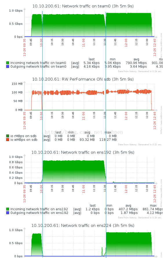 下图是zabbix的截图,team0作为iscsi target的网络端口,sdb作为iscsi target的后端存储,在ens192或ens224掉线的情况下,team0都能正常工作, 数据传输没有受到影响。