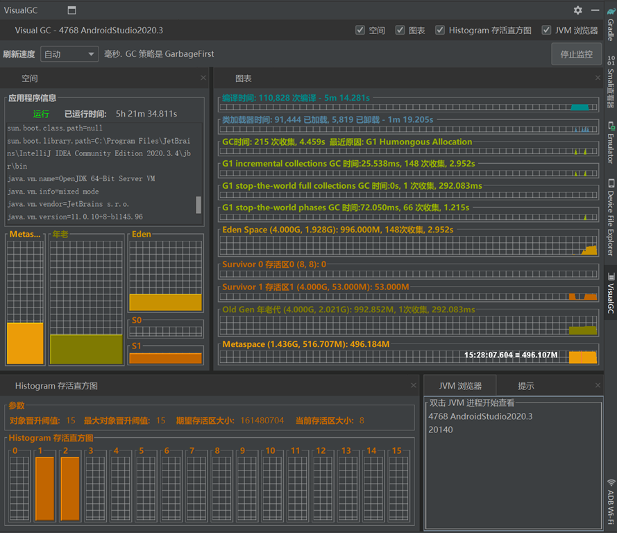 在IDEA中显示 VisualGC 工具窗口或打开新窗口, 便于一边运行代码一边观察GC情况. 仅支持HotSpot JVM(JDK 1.5 到 OpenJDK 17). 增强功能: 允许监控详细的GC活动例如 G1 Full GC 消耗时间.
