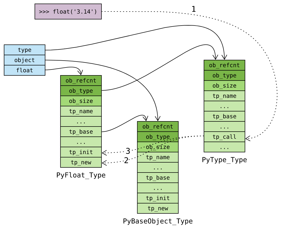 - tp_call函数在必要时将继续调用float的tp_init函数对实例对象进行 初始化。