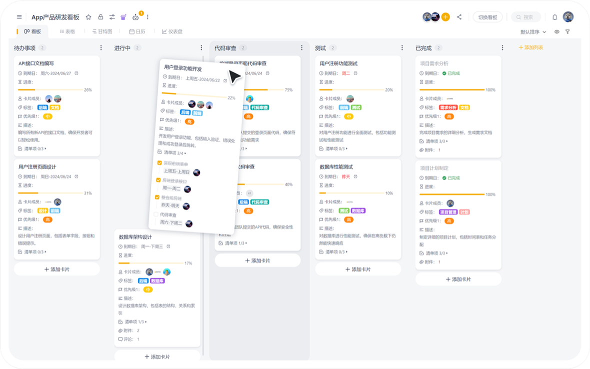 ● 项目规划:团队可以创建项目看板,并在其中设立不同的阶段和任务列表,如“需求分析”、“设计开发”、“测试验收”等。通过拖拽卡片,团队成员可以轻松调整任务优先级和进度,确保项目按时完成。