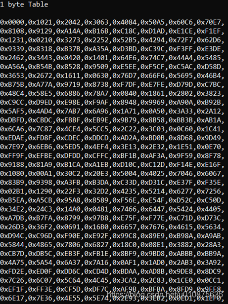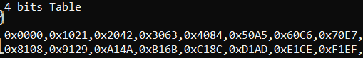蓝色部分是0还是多项式与被除数高4bit有关,其目的是为了消除被除数的高4bit,因此蓝色部分计算出来的值要与被除数高4bit一样。高4bit可以是从0000-1111有对应16种情况,因此我们可以得出一个以高4bit为索引的table,table内容是低16位的异或后的值。