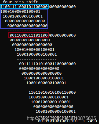 每次取高4bit为索引,获取到低16位的异或值,然后与原值低16位异或即可得到余数(上上张图的褐色部分)。