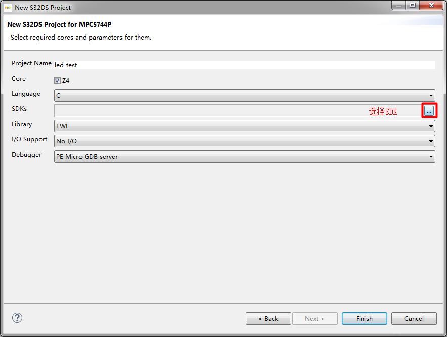 新建一个S32SD项目,名称为led_test,芯片选择MPC5744P,SDK选择最新版本,注意不要选择FreeMaster,当前版本自动配置有些问题,我们后面手动配置。若是以后有更新,大家可以添加FreeMaster自动配置试试。