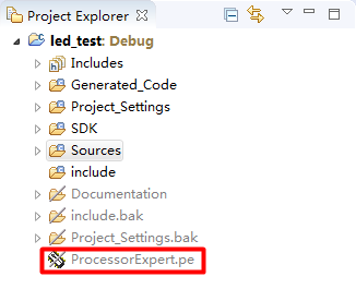 新建项目完毕,我们会在项目最底下看到ProcessorExpert.pe文件,在菜单栏显示Processor Expert,可以看到配置项,系统自动将核心配置已经添加进去了。