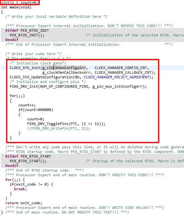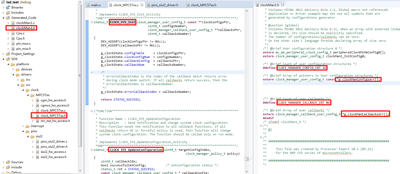 例如我们要初始化时钟。调用clock_MPC57xx.h和cloclMan1.h中的函数和参数即可。设置pin脚也是这样。