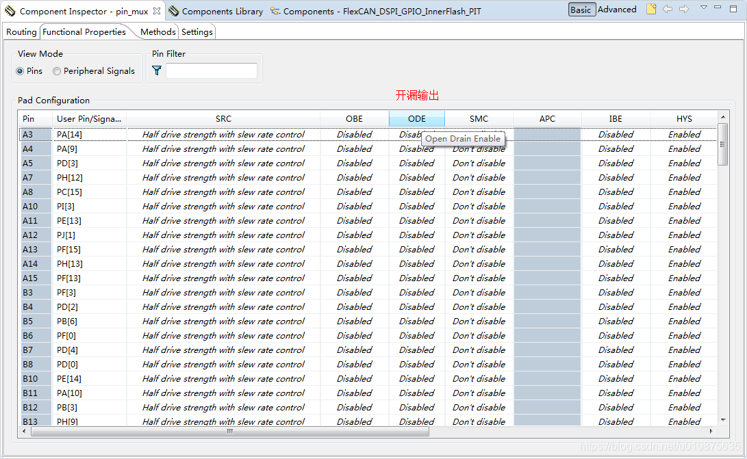 若是还想进行高级设置,例如开漏,上下拉等等,在pin_mux的Functional Properties界面选中Pins选项,就可以设置。
