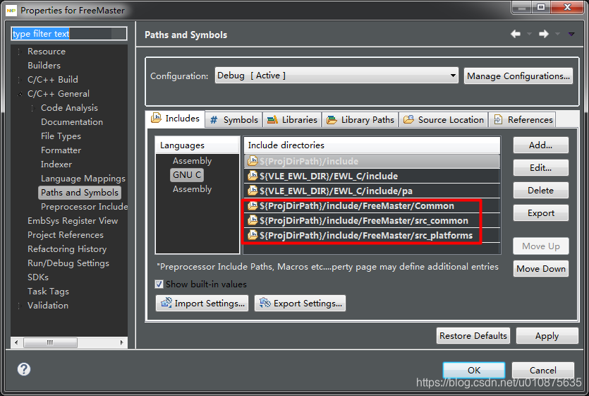 5、项目属性->C/C++ General->Paths and Sysbols中Includes添加上述三个文件夹的相对路径