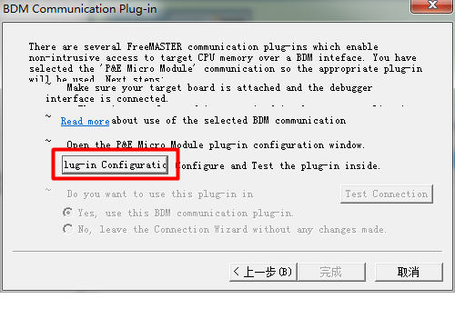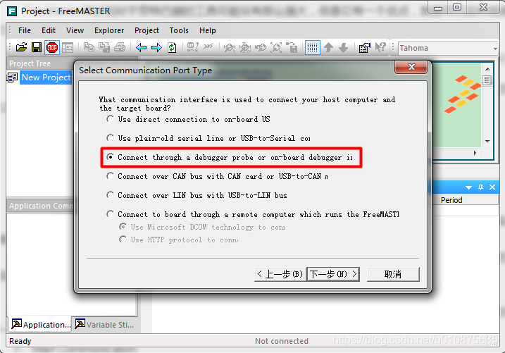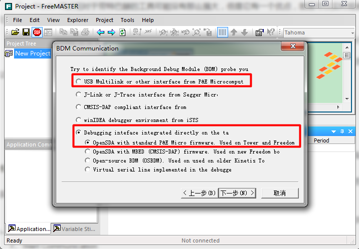 3、Tools->Connection Wizard,FreeMaster可以通过多种接口调试,常规的可以用串口或者CAN或者on-board debugger,一般用调试器即可,可以不需要多配置外设,并且不需要增加FreeMaster源码,程序不用做任何更改。