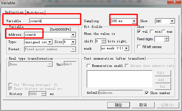 6、新建一个观察变量,输入我们要观察变量地址符号,例如全局变量uint32_t count,输入count即可,变量取名随意,最好一致,Sampling为采样时间。