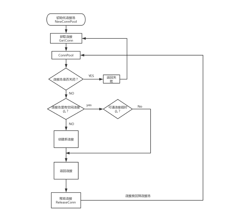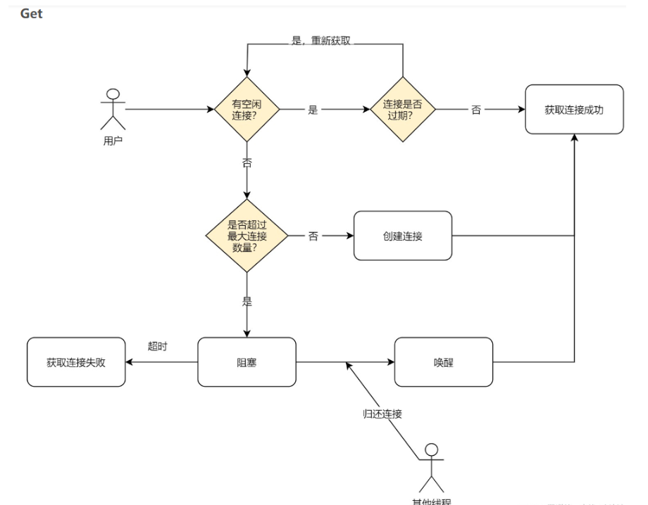 没有超过连接池最大连接数,如果空闲连接切片中有连接,则判断获取到的连接是否超时;如果没有空闲连接则创建一个新连接,创建成功返回,创建失败则将之前技术管道容量减少的一个单位还原。