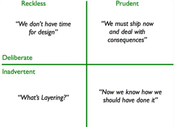 几年后,Martin Fowler 将 McConnell 的概念更进一步,发表了“技术债务四象限”,根据意图和上下文将技术债务分为 4 类。Fowler说技术债务可以首先根据意图进行分类:是有意的还是无意的?然后进一步区分是谨慎的还是鲁莽的债务。