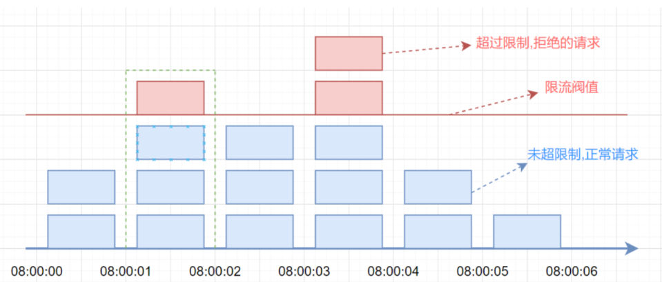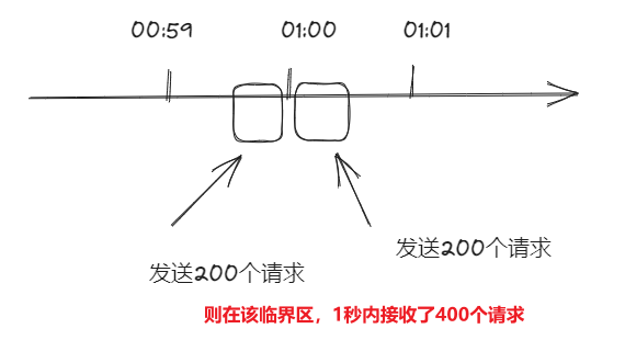 如果有个需求对于某个接口 /query 每分钟最多允许访问 200 次,假设有个用户在第 59 秒的最后几毫秒瞬间发送 200 个请求,当 59 秒结束后 Counter 清零了,在下一秒的时候又发送 200 个请求。那么在 1 秒钟内这个用户发送了 2 倍的请求,这个是符合设计逻辑的,这也是计数器方法的设计缺陷,系统可能会承受恶意用户的大量请求,甚至击穿系统。