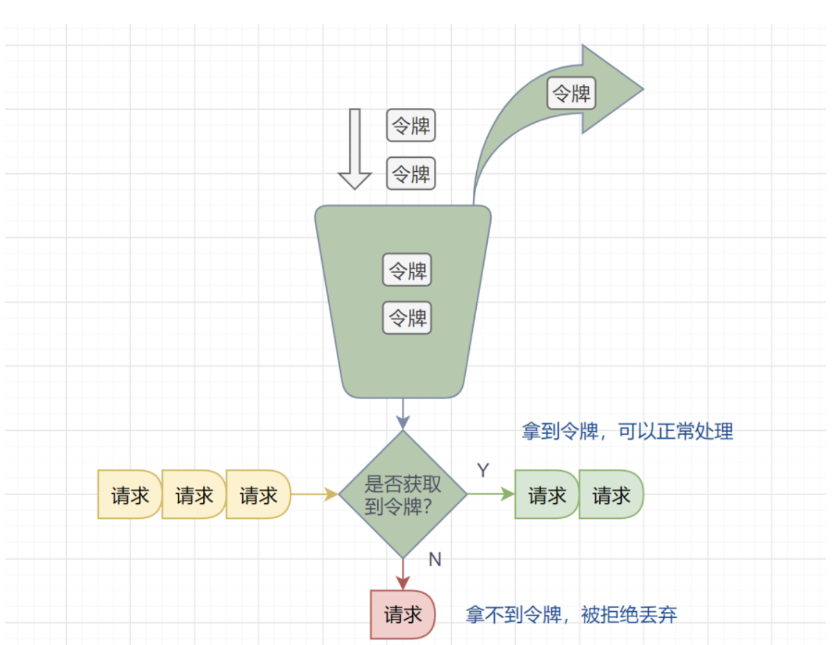 令牌桶限制的是平均流入速率(允许突发请求,只要有令牌就可以处理,支持一次拿多个令牌),并允许一定程度突发流量。