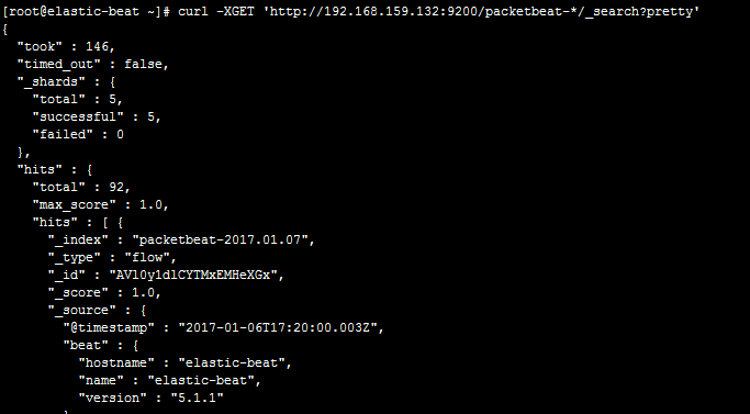curl -XGET 'http://192.168.159.132:9200/packetbeat-*/_search?pretty'显示总数为92