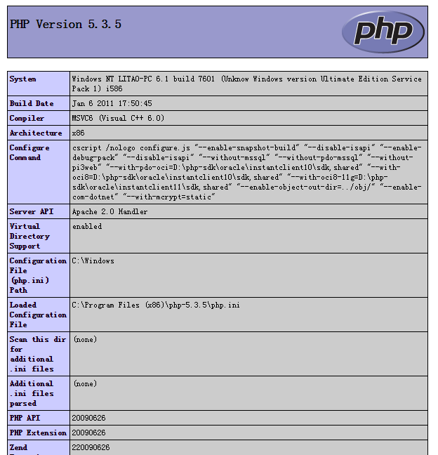 LoadModule php5_module "C:\Program Files (x86)\php-5.3.5\php5apache2_2.dll"(注意php5apache2_2.dll名称要与C:\Program Files (x86)\php-5.3.5的php5apache2_2.dll名称统一) PHPIniDir "C:\Program Files (x86)\php-5.3.5"(此为php-5.3.5的解压目录)
