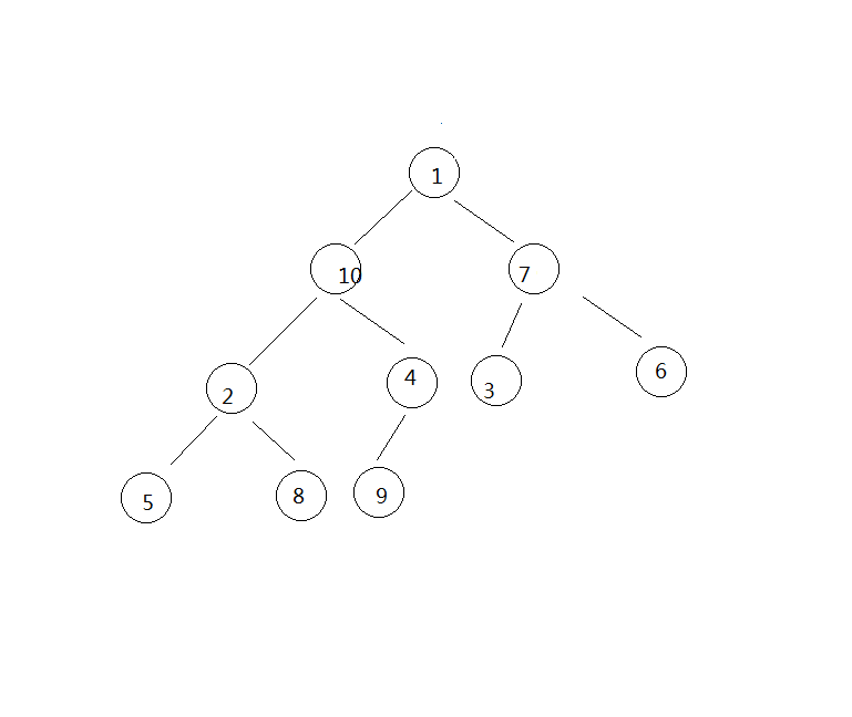 堆序性质为:偶数深度上的任意节点X,存储在X上的关键字小于它的父亲但是大于它的祖父;奇数深度上的任意节点X,存储在X上的关键字大于它的父亲但是小于它的祖父。如下图所示为根据下面的插入方法根据输入1 2 3 4 5 6 7 8 9 10生成的一个最小最大堆: