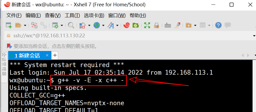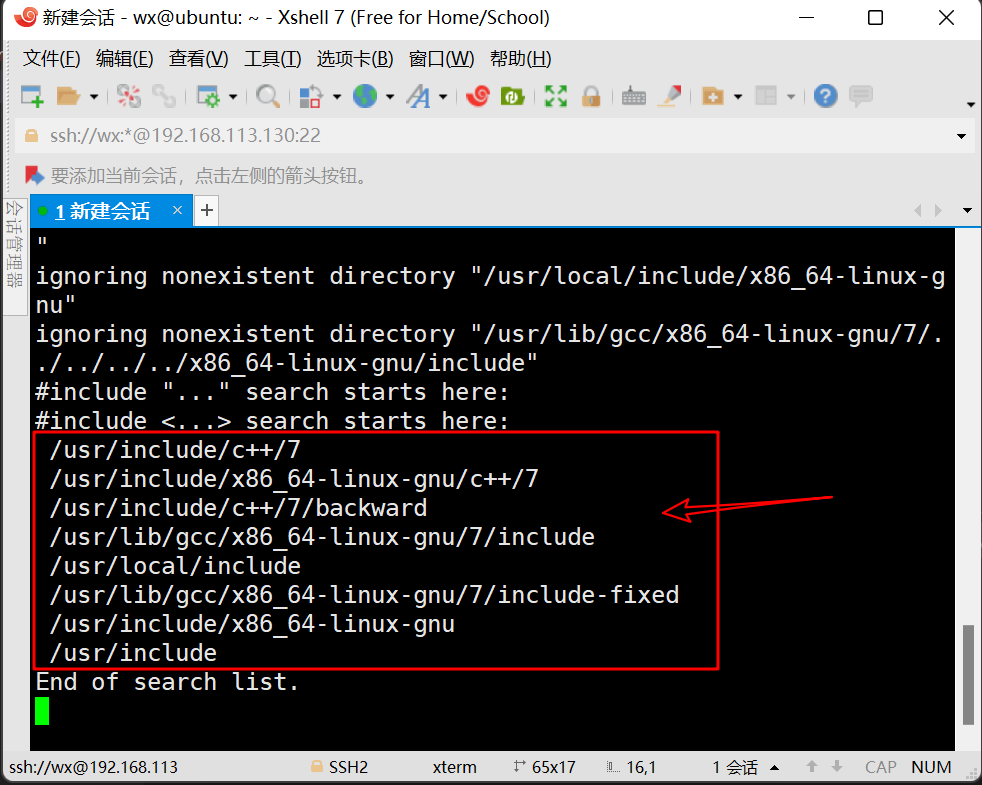 先在xshell里执行命令查看g++包含路径:g++ -v -E -x c++ -