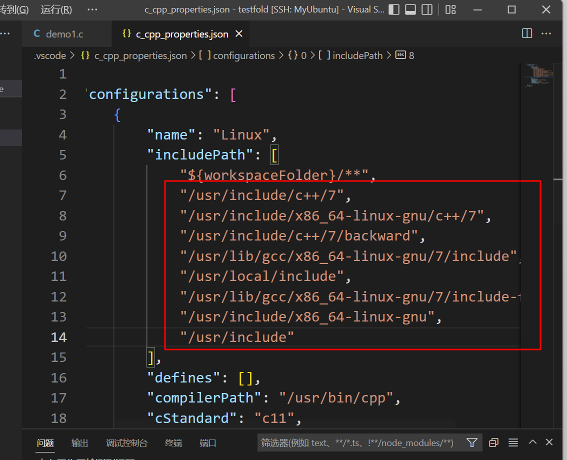 在includePath里面粘贴红框的库路径,注意每一行用双引号括起来,每个之间用逗号隔开。然后按ctrl+s保存改后的配置文件。