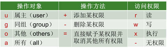 其它用户的权限:用于限制既不是属主又不是所属组的能访问该文件或目录的其他人员