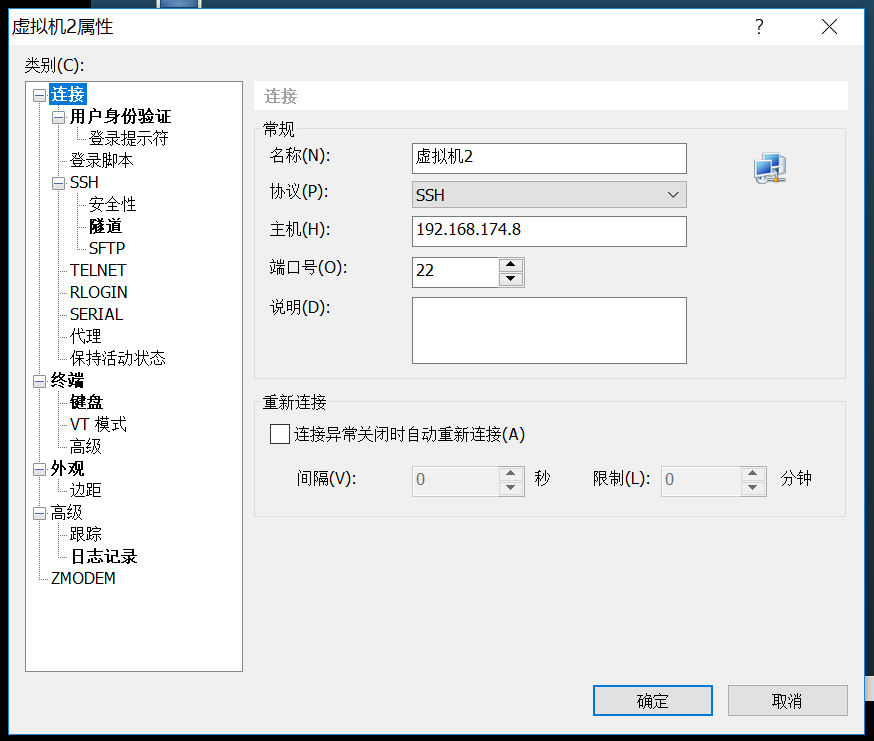 2.在把xshell连接至linux虚拟机的过程中老是出错,最后是室友掌握了核心科技,帮了我一把,在看网上资料时关于过程都很混乱,而且老师的操作流程也不给力,有的说要先设置静态ip,有的则没提,配置好后发现还是ip的问题,貌似虚拟机的设置的ip要与xshell中的一样,而不能与本机的ip完全一样,如下: